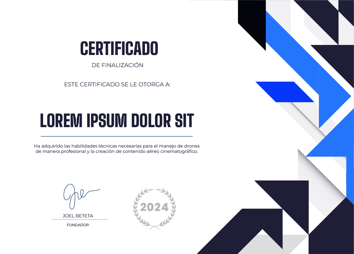 Obtendrás un certificado firmado por mí y nuestra academia de pilotos de drone