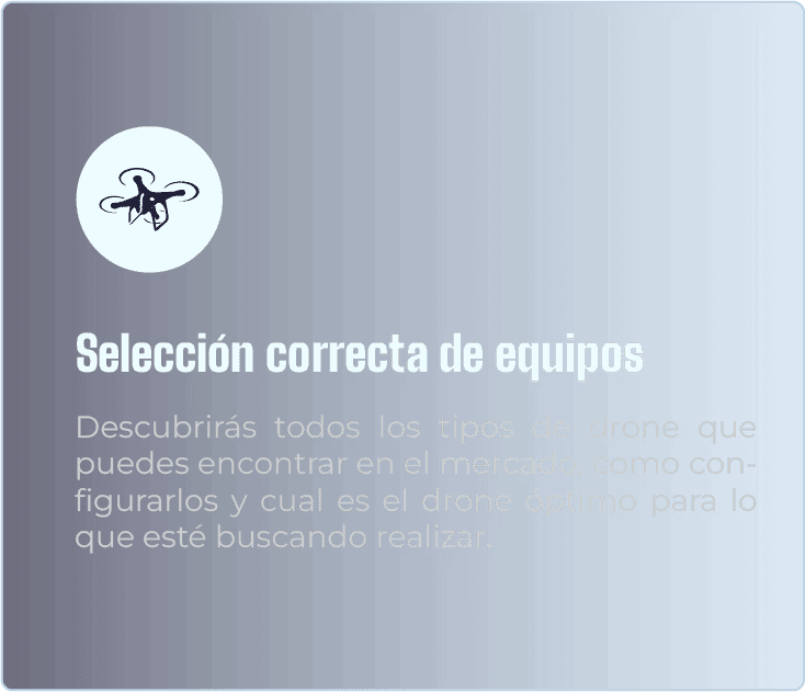 - No es necesario tener un Drone desde ya para poder iniciar con este programa, ya que está creado para que inicies totalmente de 0. El primer capítulo trata sobre “Qué Drone escoger” por lo que si estás pensando en comprar tu primer Drone o ya tienes uno, este curso es ideal para que descubras cuáles son las mejores opciones para el tipo de trabajo que quieras hacer.